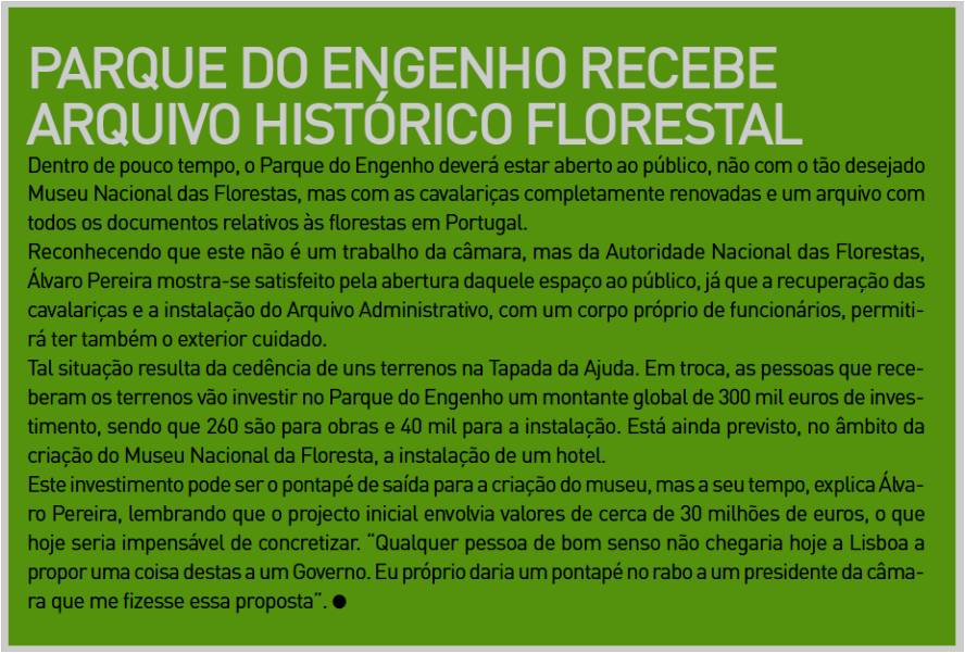 A instalação do Arquivo Histórico Florestal, onde estarão todos os documentos relativos às florestas em Portugal, parece ser, assim, o primeiro passo para a instalação do futuro Museu Nacional das Florestas neste parque.