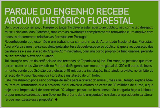 Publicada no JORNAL DE LEIRIA, de 26 de Abril de 2012, esta parece, à partida, uma boa notícia para a Marinha Grande. Se tudo correr como previsto, finalmente o Parque do Engenho passará a estar aberto ao público. As cavalariças e, no geral, todo o parque serão recuperados.
