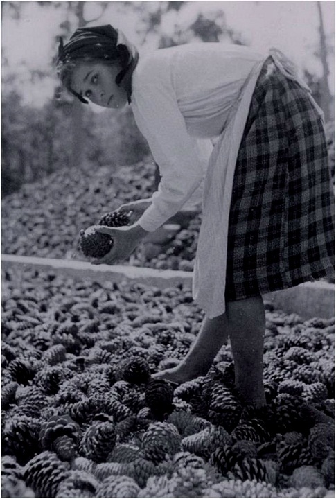 abertas, trabalhadoras dos Serviços Florestais iam batendo as pinhas umas nas
